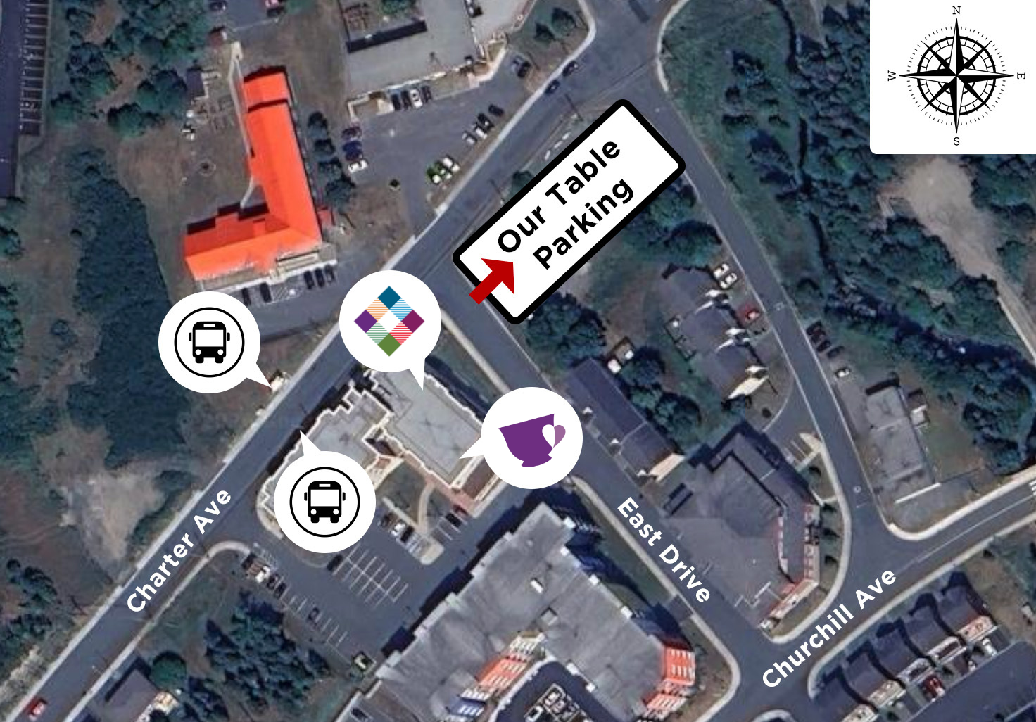 Finding Our Table can take a little extra guidance. While our address is 77 Charter Avenue, Suite 100, the entrances to Our Table and Hungry Heart Café are on East Drive, just around the corner.